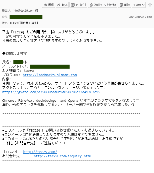 お問合せ から何かサーバーで設定変更されたのか問い合せてみたのですが、